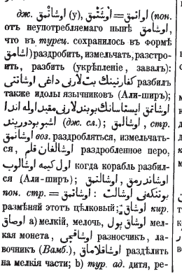 maydalamoq, bo'laklamoq, sindirmoq (va kofirlarning sanamlarini sindirdi, Navoiy) (kema halokatga uchraganda, parchalanganda)