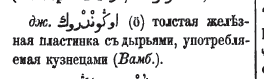temirchilar ishlatadigan teshiklari bor yo`g`on temir parchasi