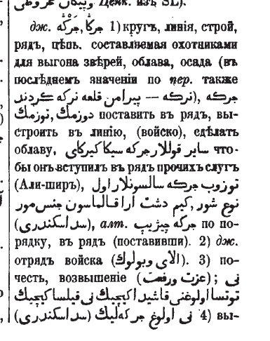 1) ovchilar tomonidan hayvonlarni haydab kirgizish uchun doira, chiziq, qator, zanjir; tuzoq 2) jangchilar otryadi 3) sharaf 4) yuqori qadr-qimmat