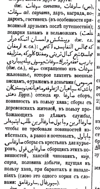 sovg'a, in'om, hadya (ayniqsa, uzoq sayohatdan qaytgach dos'tlarga beriladi); xon va ayonlarga beriladigan sovg'alar