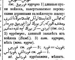 1) fors darveshlarining junli qalpoqlariga o'ralgan uzun jun mato bo'laklari 2) uzun junli matodan parda